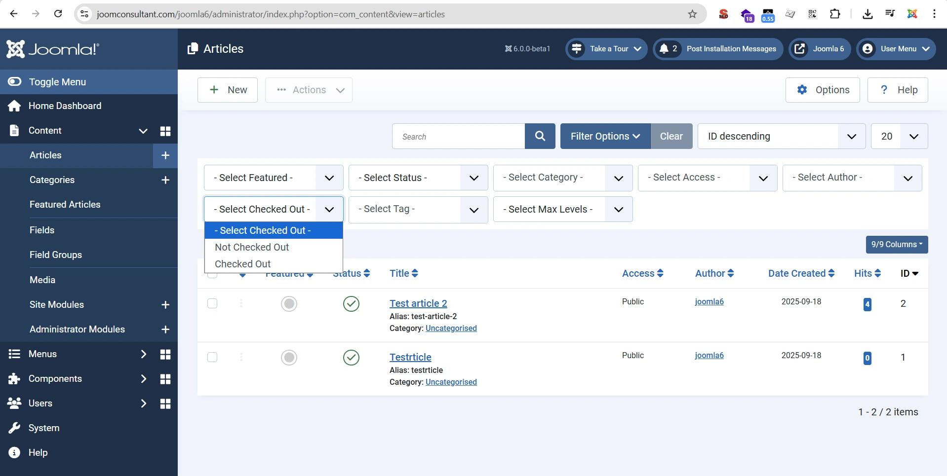 Another handy Joomla 6 change is the Checked Out filter. On busy sites, articles often get “locked” when users forget to close them. Now you can filter by checked-out status, making it easy to find and unlock such articles.