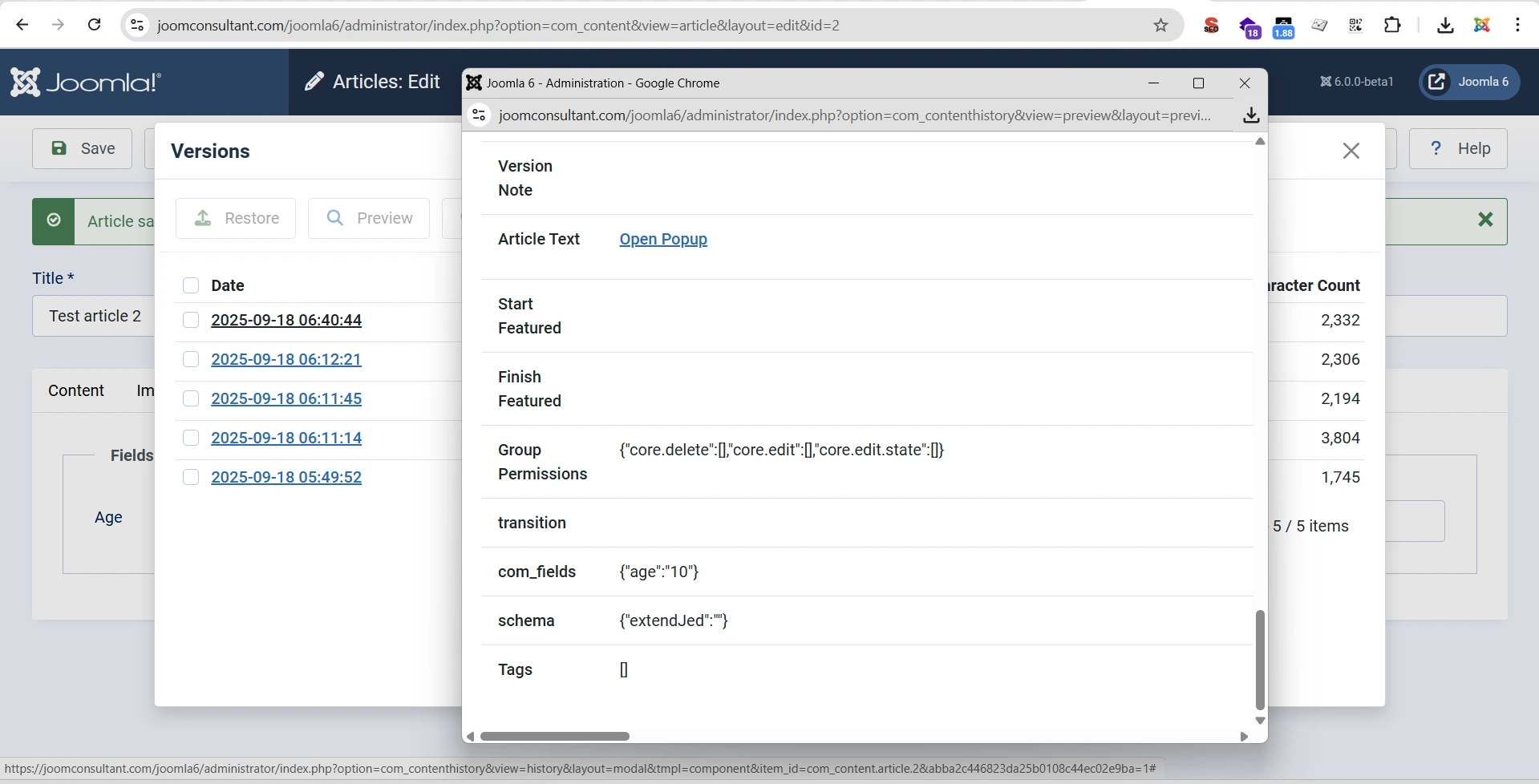 Joomla 6.0 Extended Versioning functionality Custom fields